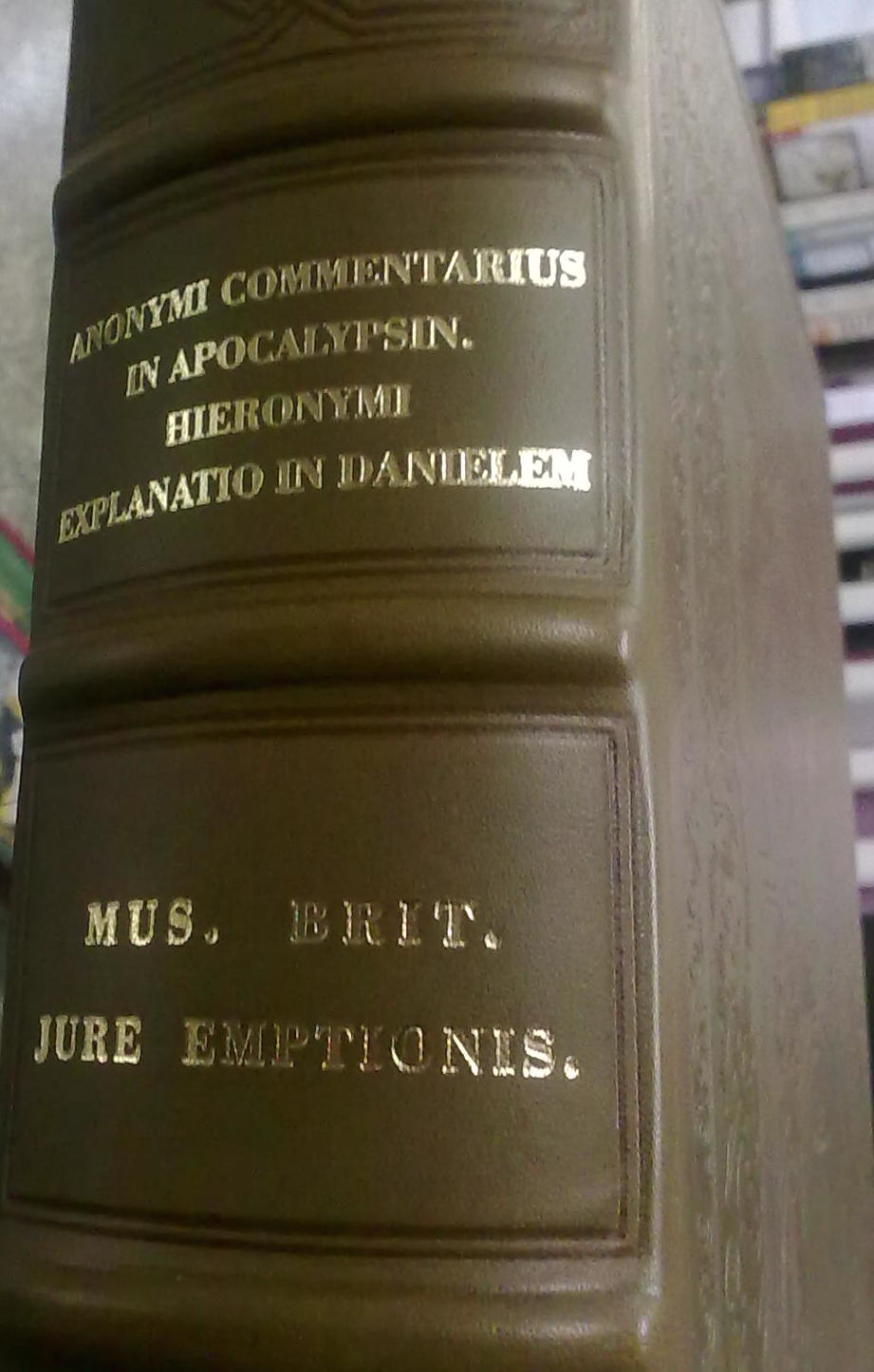 Encuadernación en piel verdosa estampada en seco